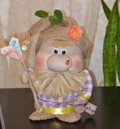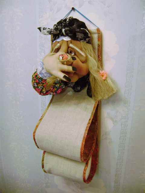 Весьма нестандартной и полезной можно назвать игрушку для туалета. Она представляет собой держатель с вместительными кармашками для туалетной бумаги и освежителя, выполненный из бязи с красивыми оборками, а также само украшение из капрона, например, в форме Бабы-Яги или человечка в домашнем халате.