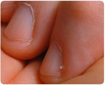 Заусенцы, трещинки на боковых валиках – дефицит белка, жирорастворимых витаминов (А, Е, Д, К), фолатов, витамина С. Виднеющиеся точечные геморрагии на ногтевом ложе, при исключении травматизации, свидетельствуют о дефиците витамина С.